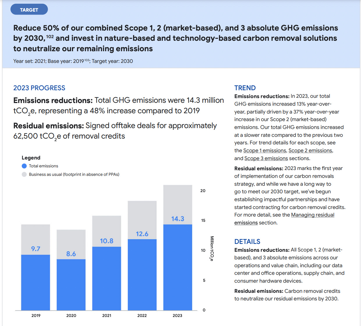 In 2021, Google committed to a Net Zero goal by 2030 and was on track to meet this goal until AI exploded in popularity and caused Google’s overall emissions to increase by 13% in 2023.